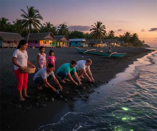 Travellers can take part in hands-on experiences, from traditional cooking to waterfall hikes and sugar-cane pressing. At the route’s heart is Fundación Agua y Tierra, where visitors can observe sea turtle conservation efforts, including the release of hatchlings into the ocean.